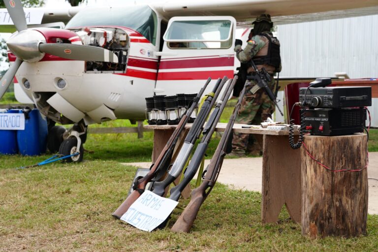 Asimismo a la par de la droga que se logró incautar también se pudo establecer que existía un hangar y una pista clandestina, donde se puedo establecer la presencia de dos avionetas cuatro motocicletas, dos motorizados, asimismo armas de fuego de grueso calibre, como dos escopetas calibre 12 MY, una pistola calibre 22 y dos fusiles también del mismo calibre, los cuales fueron llevados a instancias de la Felcn con la finalidad de poder establecer la propiedad de los mismos. Y su procedencia.