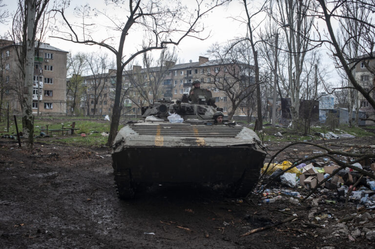 Soldados ucranianos viajan en un tanque de guerra en Bájmut, en la región de Donetsk, Ucrania, el miércoles 12 de abril de 2023. (Iryna Rubakova vía AP)