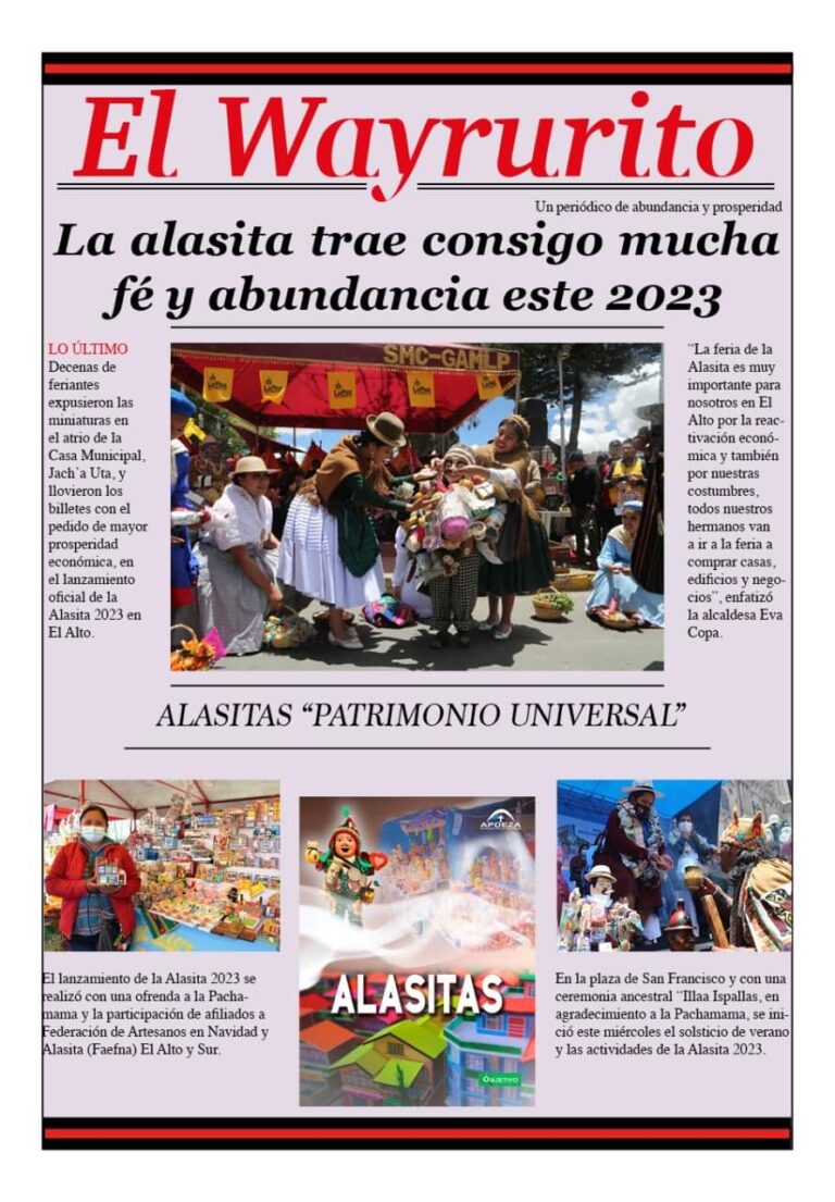 Jenny Tancara diseñó el ‘periodiquito’ ganador. La portada refiere a la inauguración de la feria de la Alasita en la urbe alteña, tiene un contenido cultural que destaca el título de Patrimonio Cultural e Inmaterial de la Humanidad, otorgado por la Unesco (Organización de las Naciones Unidas para la Cultura, las Ciencias y la Educación, por sus siglas en inglés), que despertó la atención del jurado.
